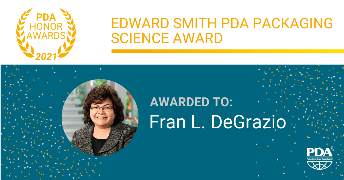 The Edward Smith PDA Packaging Science Award was created to recognize outstanding contributions to Pharmaceutical Packaging Science and was awarded to Fran DeGrazio, Chief Scientific Officer of West Pharmaceutical Services. It is presented in honor of Edward Smith and his long-term contributions to pharmaceutical packaging science.