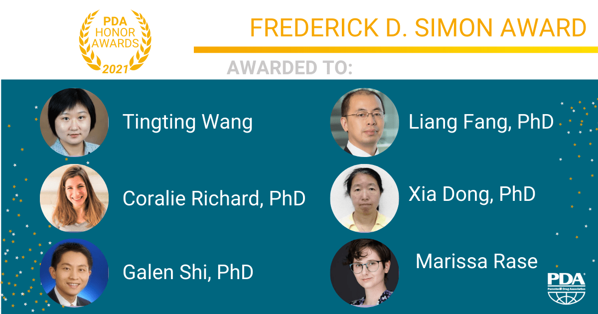 We are pleased to announce that our Scientific Insights Lab team members, Liang Fang and Marissa Rase, received the 2021 Fred Simon Award, and its Chief Scientific Officer, Fran DeGrazio, received the 2021 Edward Smith Packaging Science Award at the 2022 PDA Annual Meeting in Dallas.