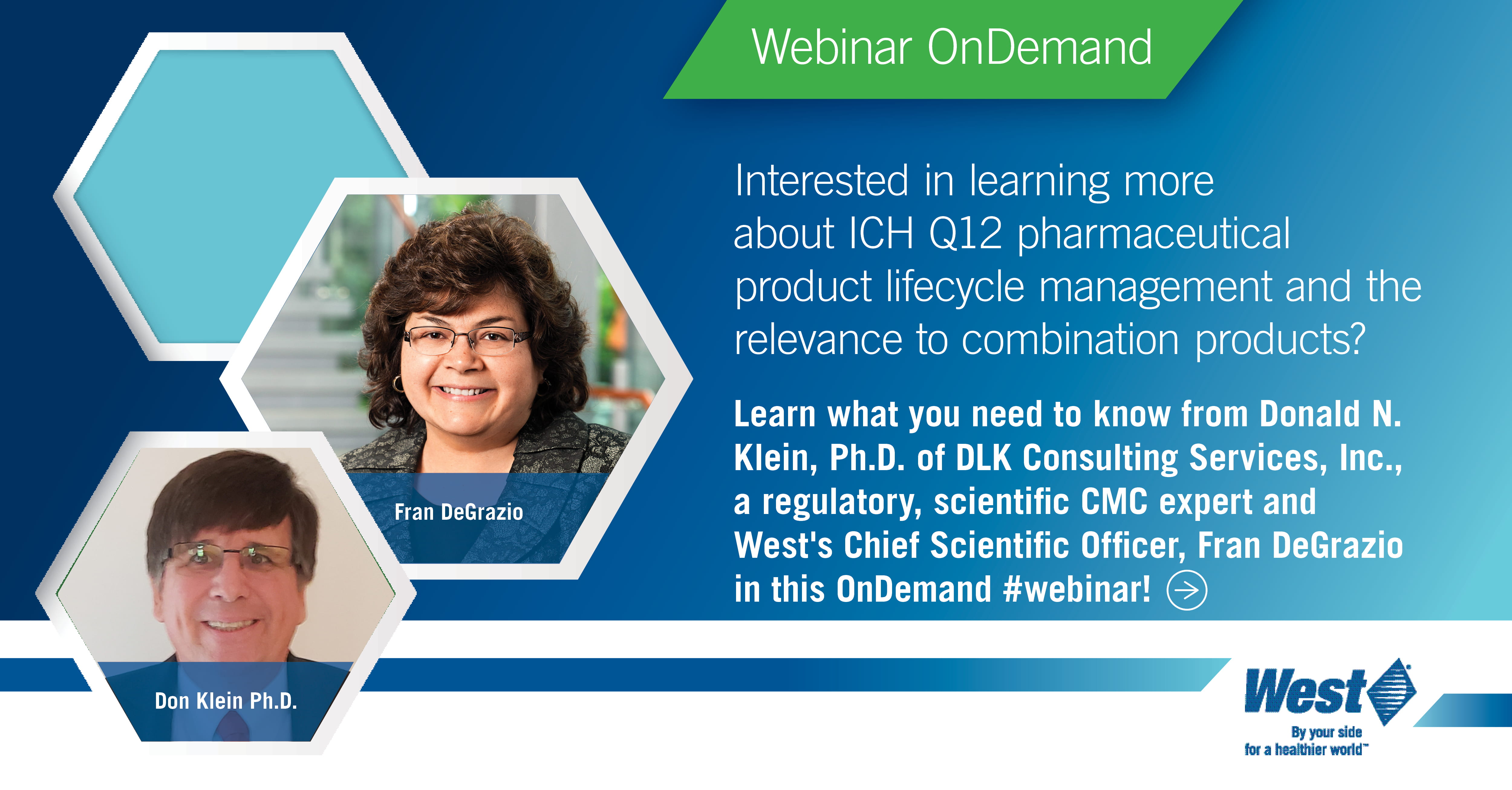 On December 3, 2020, West hosted a webinar that addressed this challenge by providing an overview of the ICH (International Council for Harmonization) Q12 guidance: Q12 Technical and Regulatory Considerations for Pharmaceutical Product Lifecycle Management. Speakers were: