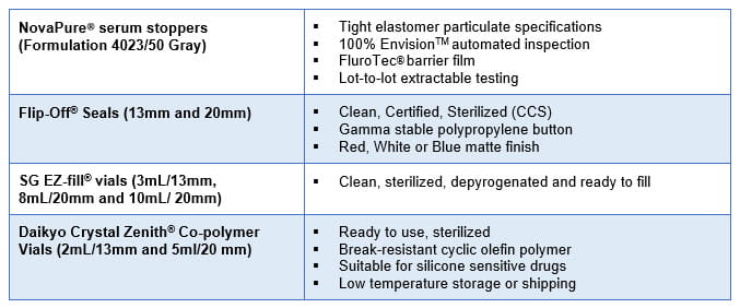 West is pleased to announce the addition of Stevanato Group’s (SG) clean, sterilized, depyrogenated EZ-fill® glass vials in 2R, 6R and 10R sizes for 13mm and 20mm stoppers and seals to its Online Store. These ready-to-fill vials are a high-quality option for general pharmaceutical use.