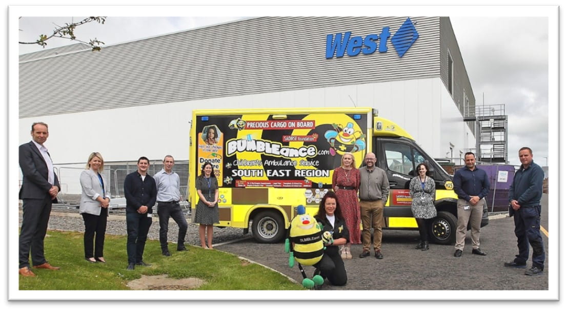 Donations raised for BUMBLEance went towards sponsoring a vehicle that will service children within the South-East Region of Ireland, making trips to hospital for vital treatments more comfortable for our youngest patients, the vehicle was officially launched in July 2021. BUMBLEance had planned to set up a depot in Waterford that aimed to provide a dedicated service for children in the Southeast Region but unfortunately due to COVID-19 this was not feasible. However, as an alternative West’s site in Waterford partnered with BUMBLEance by providing a permanent dedicated parking space on site equipped with electricity to ensure BUMBLEance can help children in the Southeast Region. In addition, as part of West Waterford’s ‘West without Borders’ campaign, West and its team members have donated funds of over €50,000 to date to support BUMBLEance.