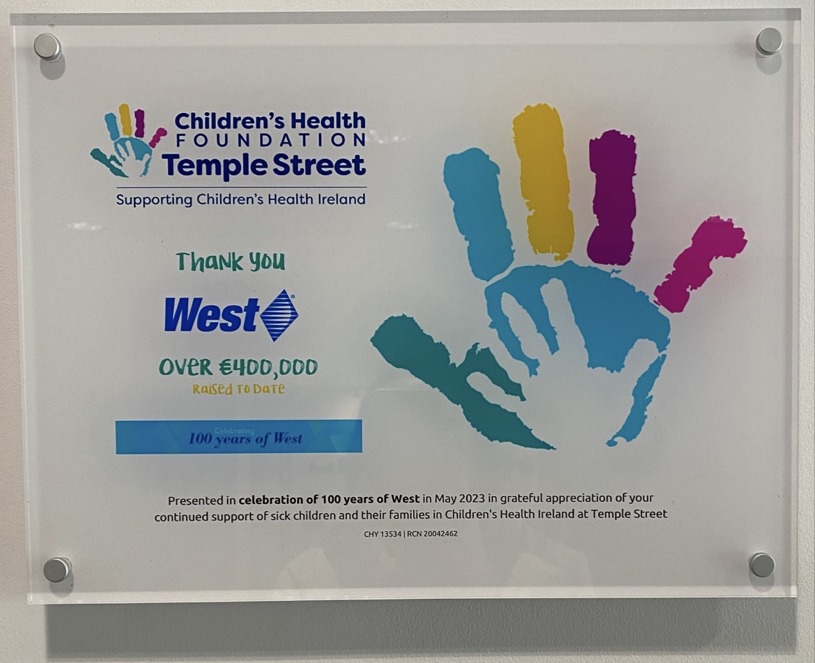 Hugh Kane, Chief Executive, Children’s Health Foundation, said: “Congratulations to West on celebrating 100 years. We are so appreciative of the ongoing support we have received from West and their staff. Through its annual ‘West without Borders’* charitable fundraising initiative, West employees have clocked up thousands of miles to make miracles happen in Children’s Health Ireland at Temple Street. Over the last ten years, they have fundraised and donated over €400,000 and the impact of these incredible donations has been seen across the hospital departments which treat sick children from all over the country. West have contributed towards lifesaving equipment and facilities including dialysis machines, patient monitors and the Renal & Neurology Outpatients Unit, to name but a few. With the continued kindness and generosity of partners like West, we will continue our vital work to support families, friends and patients from across Ireland on every step of their treatment journey – today, tomorrow and in the future.”